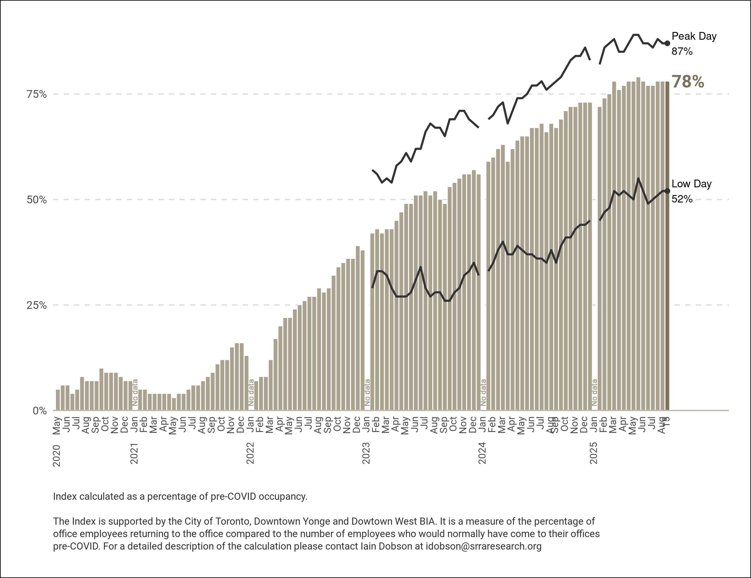 “The Occupancy Index is supported by the City of Toronto, Downtown Yonge BIA, and Downtown West BIA. It is a measure of the percentage of office employees returning to the office compared to the number of employees who would normally have come to their offices pre-COVID. For a detailed description of the calculation please contact Iain Dobson at [email protected],”