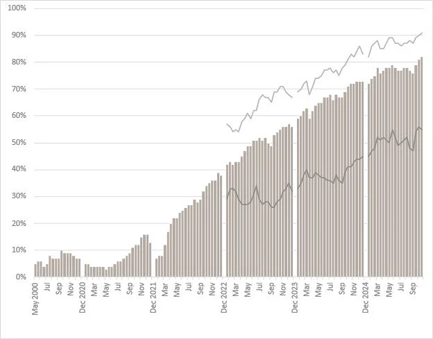 The 2025 round of ‘return-to-the-office’ mandates are having an effect on the Occupancy Index this Fall as it moves higher consistently but when people come to the office remains concentrated on the middle of the workweek. There was a spike early this Fall on Fridays and Mondays but that hasn’t continued leading many to believe that the mandates are not having an impact on spreading the commute out or easing transit congestion or helping retailers manage staff.